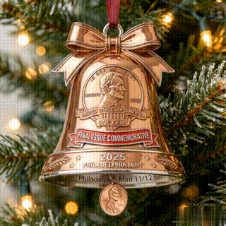 🪙🎄Mark the end of an era with this gleaming copper-toned bell ornament, a tribute to the 2025 Lincoln Penny’s final issue from the Philadelphia Mint.